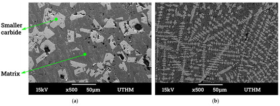 Studies show that preheating and inter-pass temperature during welding influences the microstructures and hardness [83,84]. Researchers [83] have observed that there was an increase in grain size and a decrease in hardness while using higher inter-pass temperatures. Likewise, an increase in stress cracks on the weld–substrate interface was observed while using lower inter-pass temperatures. Figure 8 shows that preheating causes smaller and finer carbide distribution in the matrix, when compared to samples without preheating [84]. Thus, preheating enables a suitable microstructural formation during hardfacing. However, it should be noted that the effect of preheating will become less significant with an increase in the number of deposition layers.