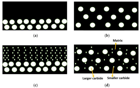 Schematic diagram of carbide distribution pattern: (a) single layer and lower current, (b) non-continuous multilayer and lower current, (c) continuous multilayer and slightly higher current, and (d) more continuous multilayer and higher current. Reprinted with permission from Ref. [84]. Copyright 2023 Elsevier.