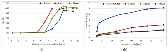 (a) Hardness and (b) wear profiles obtained for different layers of E508B hardfacing alloy [93].