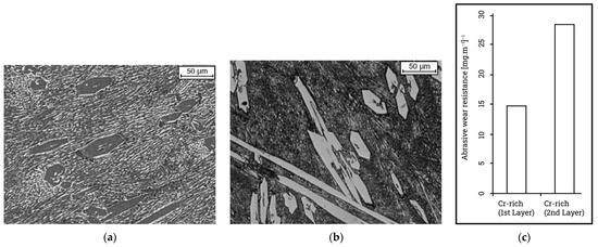 Increasing the number of hardfacing alloys significantly reduces the dilution, increases the hardness, and improves the microstructure, thus, enhancing the overall mechanical characteristics of the deposits. Studies on iron-based hardfacing deposits with single- and double-layers show higher hardness and greater wear resistance in the double-layered samples [90,91]. As shown in Figure 4, an increasing number of hard layers also improved the resistance to wear loss [47]. Earlier works have suggested that using multiple layers of deposit lowers the dilution and improves the distribution and size of hard phases in the microstructures, which increases the overall hardness of deposits [47,84,92]. Figure 10, derived from [84], shows how the increase in the number of deposition layers and welding current would influence the distribution of carbides and their size in the matrix. The study was conducted by performing single-layer and three layers of tungsten carbide deposition using different welding currents. Results from another multilayer deposits investigation also confirmed that increasing the number of layers reduces the dilution, thus, improving the microstructure and, hence, the hardness and wear resistance of the hard layer, as shown in Figure 11 [92,93]. Furthermore, multilayer hardfacing is also suggested to reduce internal surface defects and improve the bonding strength and wear resistance [94].