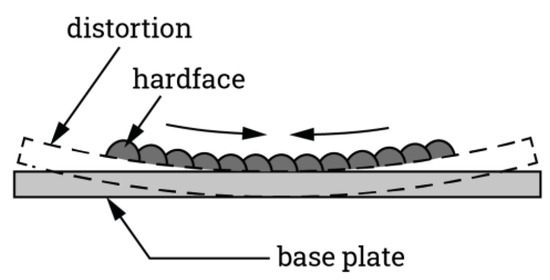 Preheating of steel base metals is often required to prevent cracking in the base metal and the deposits, to strengthen the bonding between deposit and substrate, and to minimise the distortion in the base plate [1,60,80]. Previous studies have demonstrated that preheating the substrate samples resulted in a reduction in macroscopic distortion [81]. Another study using a cast iron substrate and an iron-based hardfacing consumable observed lower crack length per unit area in the deposits produced by preheated substrate [82]. Although preheating is important, it may not be essential for all hardfacing. The need for preheating depends upon the type and thickness of base metal used. The preheating temperature, T (°C) can be calculated using the following Seferian formula (Equation (1)) [1]: