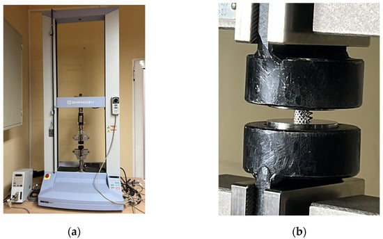 The Shimadzu Table-top AGS-X 10kN universal testing machine (Shimadzu, Kyoto, Japan) was used for conducting compressive testing. This machine consists of essential components, such as a rigid frame, a movable crosshead, test fixtures (jaws) for specimen gripping, force sensors, and a control unit. Figure 3a provides an illustration of the universal testing machine, while Figure 3b displays examples of the tested specimens.