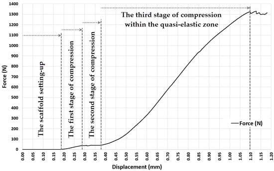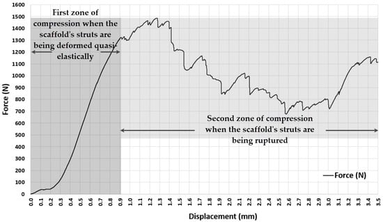 Firstly, a single-step compression test was carried out with a compression speed of 1 mm/min. This was done to determine the zones where the behavior of the scaffold changes (the point where plastic buckling/crushing starts, plateau force, densification, and scaffold failure point []).
