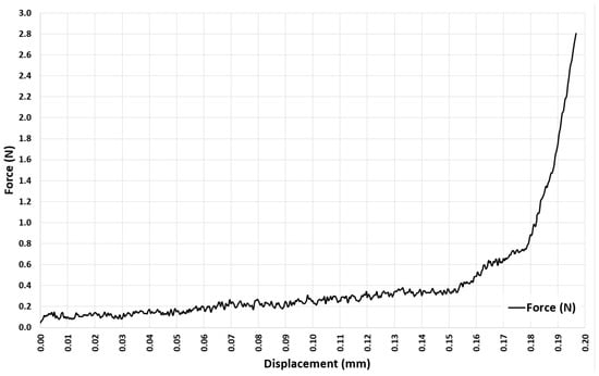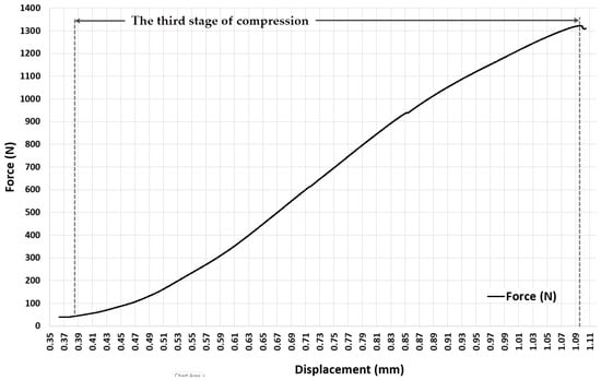 During the fourth compression-relaxation cycle, the compression force limit was set to 150 N, resulting in a deformation of the ASLS structure of 0.41 mm. Subsequently, the ASLS structure was relaxed by lowering the compression force to 55 N (Figure 15). Once again, it should be noted that after relaxation, the ASLS is capable of withstanding compression up to 150 N, exhibiting almost linear proportionality between the stroke and reaction force. Hence, within this range of compression force, the ASLS deforms with full reversibility, acting as an elastic structure. This cycle led to a further increase in the elasticity modulus, which became approximately E ≈ 6278 N/mm2. σ_after_150N_stiffening (ε) = 6278·ε, indicating an increase of approximately 260.55% compared to the second compression stage (1842 N/mm2·2.6055).