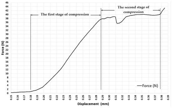 A closer look at the first two stages of compression, with the first stage defined between 1 and 37 N, and the second stage between 37 and 40 N.