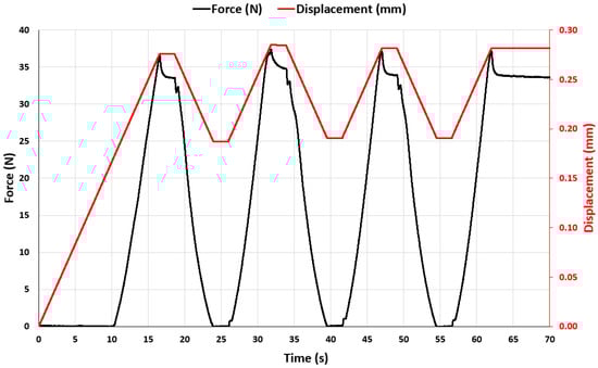 Finally, a four-cycle loading-unloading test was carried out to see if the scaffold exhibited signs of plastic hardening. The scaffold was compressed until a force of 37 N was reached, this force was maintained for 2 s and then the scaffold was unloaded down to a force of 0.1 N (still keeping the scaffold in contact with the fixtures), at which it was also maintained for 2 s.
