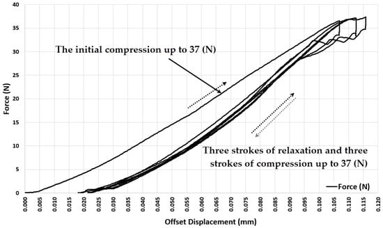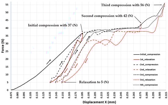 The entire range of F(x) relation indicates the complex quasi-linearity of the scaffold structure’s elasticity. However, from an application perspective, it is crucial to examine whether the ASLS structure can behave as a simple elastic structure. Therefore, we conducted several series of measurements to determine how the ASLS structure stiffness increase occurs during deformation. The tests involved relaxation (unloading) of ASLS structure after reaching the characteristic force limit of each compression (loading) phase and repeating the cycle multiple times. The compression and decompression strokes were performed at the same speed of dx/dt = 1 mm/min, i.e., 0.01667 mm/s (Figure 10).