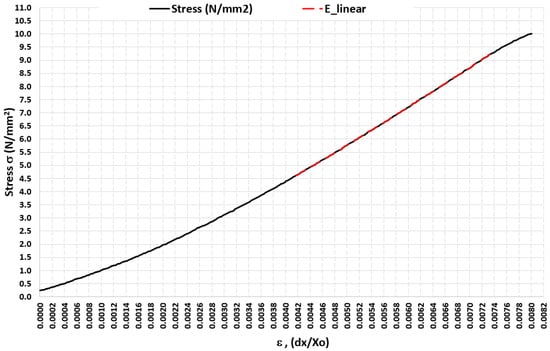 The diagram of the approximately calculated normal stress (σ) in function of strain (ε) for the first stage, i.e., after stiffening the ASLS. E ≈ 1479 N/mm2, σ_after_initial_stiffening (ε) = 1479·ε.