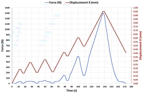 Upon exceeding the limit of the second compression stage (>55 N), the ASLS structure enters the third stage of deformation, characterized by a steeper slope of F(x) compared to the first stage. This stage culminates in the fracture of the first strut of the scaffold (a little bit above 1300 N). For the third compression stage, the experiment planned to determine the stiffening of the ASLS after reaching compression forces of 150 and 500 N. The compression and relaxation strokes were set at a speed of 1 mm/min, which is equivalent to 0.01667 mm/s (Figure 14).