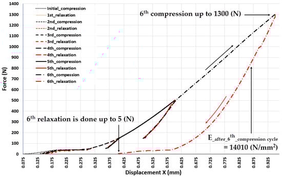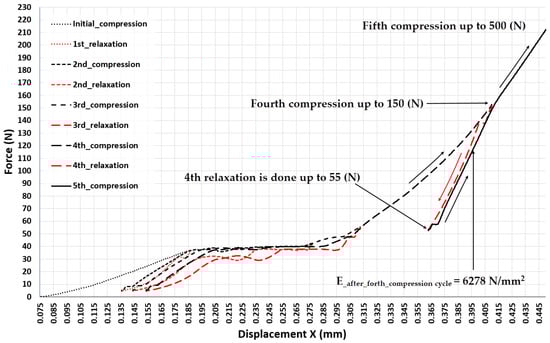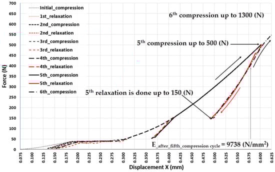 Within the fifth compression-relaxation cycle, a compression force of 500 N was applied, followed by relaxation of the ASLS structure to the level of the fourth cycle, i.e., down to 150 N (Figure 16). The outcomes of the fifth cycle were similar to the fourth cycle, with the ASLS acting as an elastic structure within the new force range. However, the elasticity modulus once again increased beyond the previous limit, reaching approximately E ≈ 9738 N/mm2.
