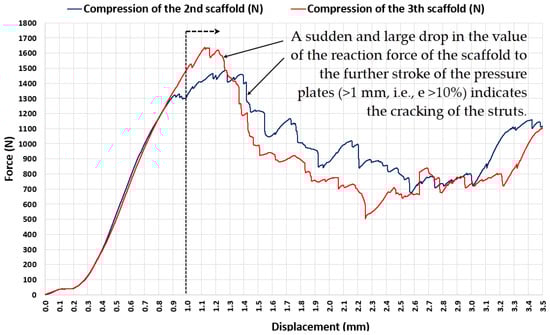 When the stroke of the pressure plates exceeds 1 mm (or 10% of the initial length of the scaffold) and the force becomes greater than 1300 N, the fracturing of the first struts becomes observable. This phenomenon is illustrated in the diagram, showing a sudden drop in the force-displacement curve (refer to Figure 18).