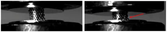 Due to the specific shape of ASLS, when compression starts, the scaffold tries to fit into the seat of the mold, looking for a stable position. In this stage of compression, shown in Figure 7, the scaffold, in fact, does not bear the load yet. In this case, after 0.15 mm, a steep slope of F(x) starts indicating the appearance of the reactive force of ASLS structure due to the pressure it starts to bear.
