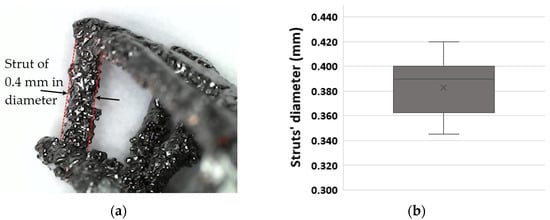 ASLS struts made through EBM in their real shape. (a) A magnified view of the scaffold strut, (b) error-bar diagram of the struts’ thickness (diameter) based on 25 measurements (5 measurements of 5 struts of non-deformed ASLSs). The designed diameter is 0.4 mm.