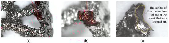 The magnified (max. 1600×) view of fractured ASLS Struts: (a,b) views of the cross-section (colored by the red felt pen) of the fractured strut, (c) the magnified view of the strut’s cross-section where it has been sheared off. The boundary of the cross-section is highlighted by an orange polyline.