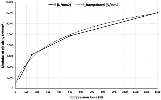 By analyzing the measurements of the reaction force at discrete deformations of the ASLS and calculating the corresponding values of the modulus of elasticity, it becomes possible to determine the relationship between the compression force and the modulus of elasticity obtained through structure stiffening (Table 6).