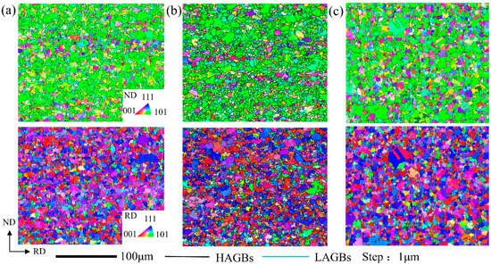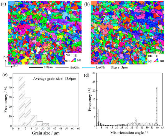 Figure 2 illustrates the microstructure of as-received plates of the A286 alloy, which consist of equiaxed grains with the average grain size of about 13.6 μm. The distribution of the grain size is not uniform and the proportion of grains with size less than 12 μm exceeds 50%. The distribution of the misorientation angle of the grain boundary is shown in Figure 2d. It can be seen from Figure 2 that the misorientation angles for the as-received sample not only contains a large number of HAGBs, as shown by the black line in Figure 2a, but also includes a large number of 0–2° LAGBs and 60° grain boundaries, indicating that the grain boundary type in forging A286 alloys includes HAGBs LAGBs and Σ3 annealing twin grain boundaries. Additionally, the grain boundaries with a misorientation of 60° have the highest proportion, reaching 22%, which can be attributed to the annealing twins formed during the forging process.