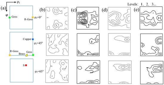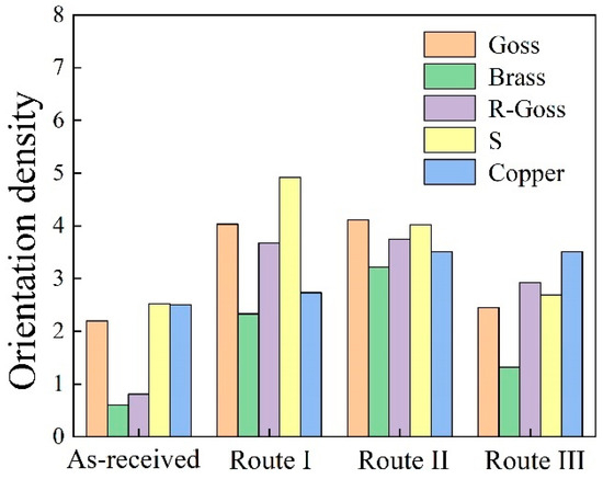 In addition, both the Brass and Copper textures deviate from the ideal orientation in Euler space observed in Route II and Route III, as shown in Figure 5, which are referred to in this study as Brass and Copper textures. The components of Brass and Copper can arrive at the orientations of Brass’ and Copper’ by deviating 10° along the coordinate axis of φ and φ1, respectively, as shown in Figure 5d,e. Twins more easily develop during the deformation of metals with low SFE [25]. Under the condition of large deformation, the obstruction of the slip leads to an increase in local stress. Once the local stress exceeds the critical resolved shear stress (CRSS) for twinning initiation, deformation twinning starts [26], consequently leading to more complex recrystallization textures such as Brass and Copper textures.
