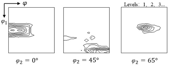 Constant φ2 = 0°, 45° and 65° sections of ODFs of the cold-rolled plates under Route I.