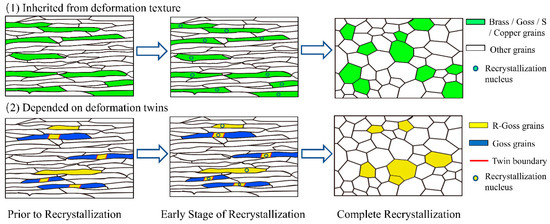 In this study, the recrystallization texture develops in A286 superalloy plates annealed at 980 °C for 60 min through two independent mechanisms related to different deformation microstructures, as schematically illustrated in Figure 9.