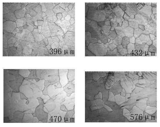 It can be seen from Figure 3 that when the shot peening time does not change, with the increase in the size of the shot, its overall kinetic energy is increasingly higher, the strain energy of the material surface is increasingly higher, and the grain refinement is relatively high. In the process of shot peening strengthening, the impact speed of the shot is relatively high, which can easily cause deformation on the surface of the test material. From the energy point of view, the kinetic energy carried by the shot after acceleration is relatively high, and the transformed strain energy is also relatively high. Therefore, with the increase in the kinetic energy of the shot, the depth of the working layer of shot peening is also becoming higher and higher.