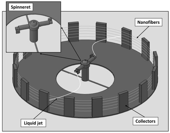 The spinneret consisted of two opposing orifices (i.d. of 0.30 mm), which was loaded with 2 mL of polymeric solution. A rotational speed of 8000 rpm was applied for the spinneret, whilst solution refills (5 refills) were made to provide the desired mass of nanofibers. The extruded nanofiber were collected on sixteen collection plates (114 mm(H) × 19 mm(W) × 6.4 mm(D)) located 12.5 cm from the spinneret orifice [37,38,40].