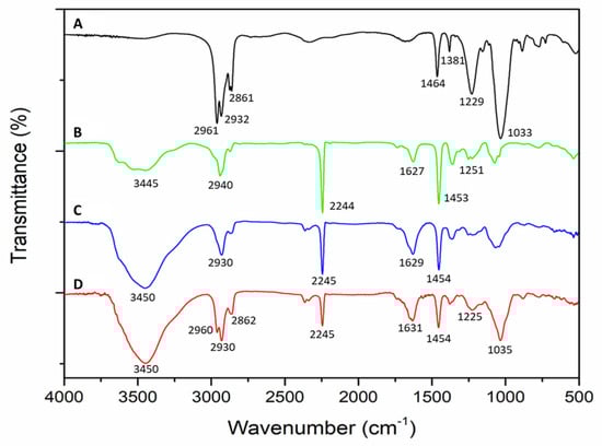 The PAN spectrum (Figure 2B) showed characteristic bands for N-H at 3445 cm−1 and stretches for C-H at 2940 cm−1 and 1453 cm−1, for C≡N at 2244 cm−1, C=C at 1627 cm−1, and C-N at 1251 cm−1 [54,55].