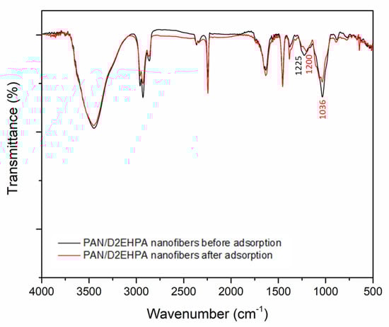 The interactions involving the PAN/D2EHPA nanofibers, before and after metal adsorption, were examined (Figure 3). The P=O bond stretching vibration originally observed at 1225 cm−1 for the nanofibers was shifted to a lower frequency of 1200 cm−1 on gallium adsorption, reflecting oxygen coordination with the metal [38]. Furthermore, the decreased magnitude of the 1036 cm−1 peak (associated with P-OH stretching) suggests substitution of hydrogen ions by the metal ions in the cation exchange mechanism [61].