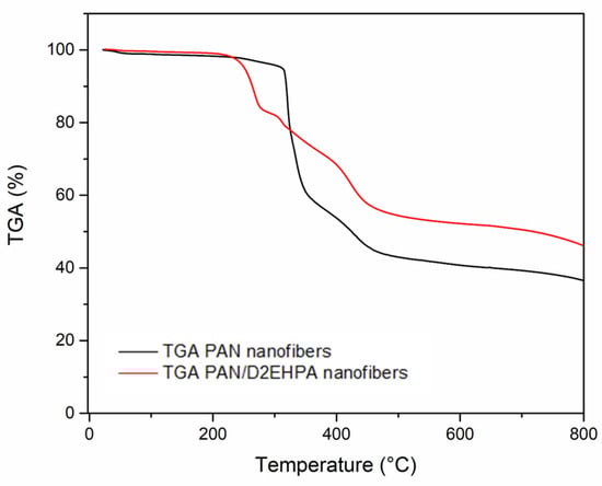 Figure 4 shows the thermogravimetric (TGA) curves for PAN nanofibers and PAN/D2EHPA nanofibers with polymer/extractant ratio of 80/20 (% w/w). The curves present an initial weight loss of up to 5% between 30 and 310 °C and between 30 and 240 °C for the PAN nanofibers and the PAN/D2EHPA nanofibers, respectively. This initial weight loss may be attributed to the removal of water and residual DMF in the polymer [31].