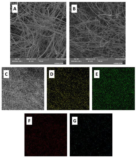 The SEM-EDS mapping of the PAN/D2EHPA nanofibers after adsorption of the metal showed (Figure 5C–F) good uniformity in distribution along the nanofiber surface for carbon, nitrogen (present in the polyacrylonitrile), phosphorus, and oxygen (D2EHPA). This confirmed that the extractant was well adhered to the fibers’ structure along their entire length. Significantly, gallium (Figure 5G) was also observed uniformly distributed along the nanofiber surface after adsorption.