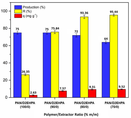 Figure 6 shows the gallium adsorption capacities and removal efficiencies for the nanofibers using different polymer/extractant ratios. The nanofiber production yield was also evaluated according to the percentage of extractant in the polymeric solution.