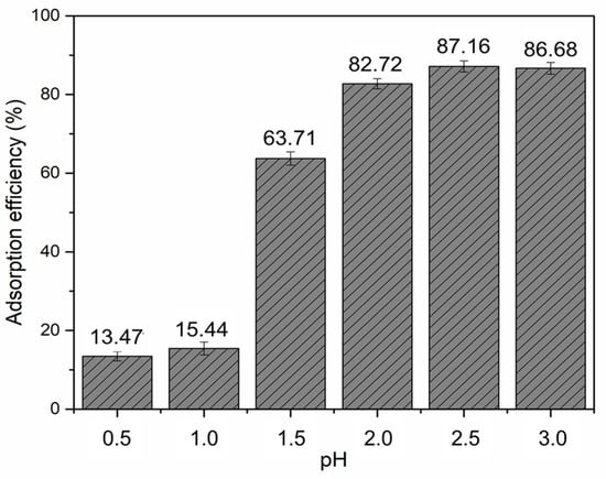 A study on the effects of pH on gallium adsorption (Figure 8) revealed that pH 2.5 was optimal for maximum Ga adsorption efficiency, which was in agreement with the literature [3,20,51]. A lower pH introduces competition from greater concentrations of H+ ions with gallium ions, thus preventing adsorption of the Ga3+ cations [20,51]. Thus, pH 2.5 as the optimal value was used for the subsequent adsorption experiments.