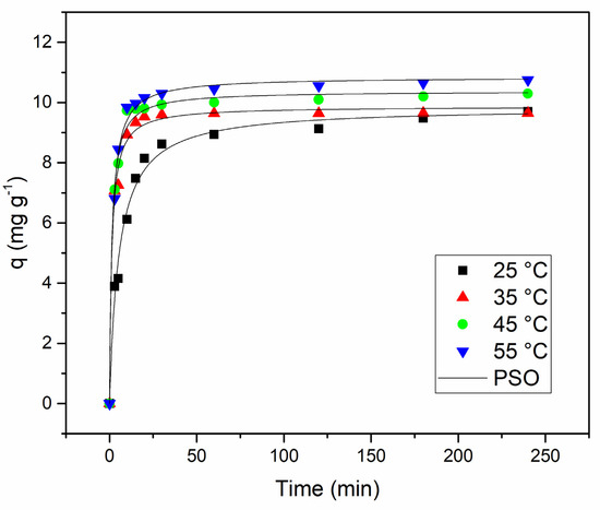 PSO kinetic model for Ga adsorption by the PAN/D2EHPA nanofibers. Conditions: concentration of Ga = 20 mg L−1; polymer/extractant ratio = 80/20 (% w/w); S:L ratio = 1:500 (g mL−1); pH = 2.5; temperature = 25, 35, 45 and 55 °C; contact time = 0, 3, 5, 10, 15, 20, 30, 60, 120, 180, and 240 min.