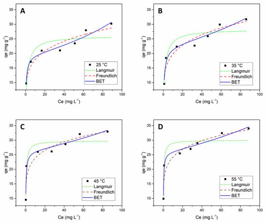 Equilibrium isotherm curves were adjusted to the experimental data using Langmuir (Equation (6)), Freundlich (Equation (7)), and BET (Equation (8)) models. The Langmuir isotherm indicates that adsorption occurs in a monolayer on a homogeneous adsorbent surface. Furthermore, it assumes that the active sites on the surface of adsorbent have the same affinity and energy for adsorption. [47]. The Freundlich isotherm is not restricted to a single layer formation and assumes that the adsorbent surface is heterogeneous [48]. Brunauer, Emmett, and Teller (1938) proposed a theory for the adsorption phenomenon based on the same mechanism of Langmuir’s theory, although this model assumes that molecules are adsorbed in overlapping layers, which means a layer has the great ability to generate adsorption sites, causing the deposition of one onto another [49].