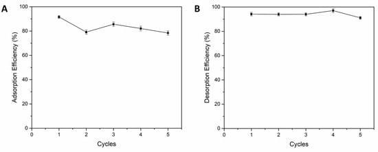 Desorption and regeneration of PAN/D2EHPA nanofibers: (A) adsorption and (B) desorption efficiencies during five cycles of reuse. Adsorption conditions: concentration of Ga = 20 mg L−1; polymer/extractant ratio = 80/20 (% w/w); pH = 2.5; S:L ratio = 1:500 (g mL−1); contact time = 60 min; temperature = 55 °C. Desorption conditions: polymer/extractant ratio = 80/20 (% w/w); S:L ratio = 1:250 (g mL−1); temperature = 25 °C; contact time = 5 min.