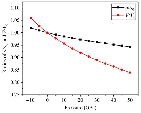 To analyze the influence of applied pressure on the cell volume and lattice parameter of the FeTi alloy, some structure optimizations were carried out to calculate the equilibrium lattice parameter at multiple pressures. The and ratios of cell volume and lattice parameter are shown in Figure 3 with regard to applied pressure. Figure 3 shows that the and ratios decrease with an increase in applied pressure, and the ratio of volume compression under pressure is much smaller than the ratio of lattice parameter compression, indicating that the inter-atomic distance becomes smaller and the electronic interaction is enhanced under high pressure.