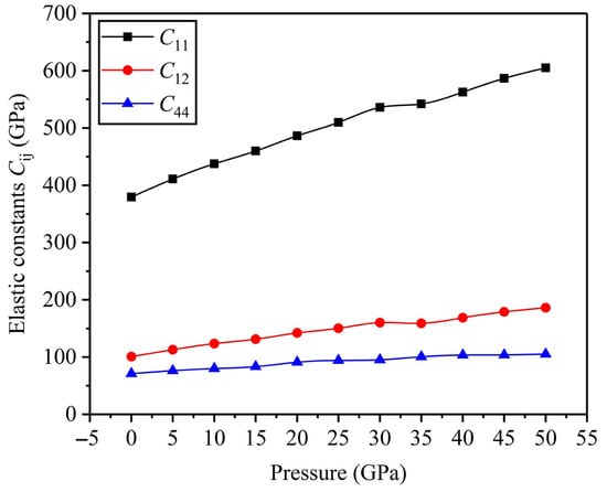 In addition, Figure 4 intuitively exhibits relation curves of elastic constants with regard to applied pressure. In general, an elastic constant can be obtained by computing the elastic stiffness constants for second-order terms of the strain energy [32], while this work uses the stress–strain method to calculate elastic constant Cij [33,34,35]. The results in Figure 4 indicate that C11, C12, and C44 gradually increase with an increase in applied pressure within the range of 0 GPa to 50 GPa. Additionally, C11 increases at the fastest rate. The stability criterion of expression (1) is satisfied by C11, C12, and C44, which means that the FeTi alloy can remain stable under high pressure and the structural phase transition occurs with difficulty.