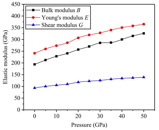 Figure 5 shows variation curves of Young’s modulus E, bulk modulus B, and shear modulus G versus applied pressure. From Figure 5, the results indicate that E, B, and G monotonically raise as applied pressure increases, suggesting that FeTi alloys have stronger resistance to the elastic, bulk, and shear deformation when applied pressure increases.