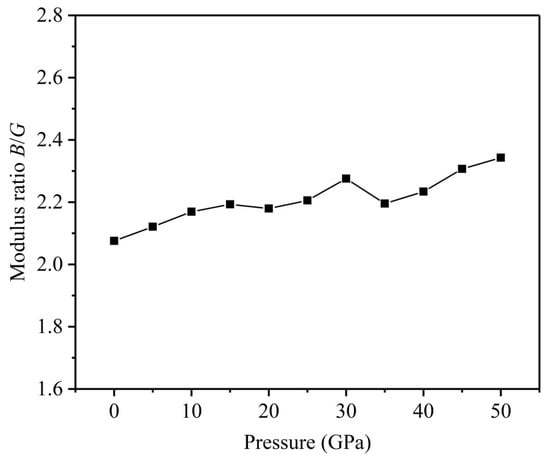 Ductile-to-brittle transition occurs easily during material phase transition. For polycrystalline pure metals, Pugh et al. [37] revealed that the ratio was used for assessing the ductile/brittle properties. In general, the critical value is to distinguish brittle or ductile material. The material for exhibits brittleness, and the material for characterizes toughness, and a bigger indicates better ductility, while a smaller represents stronger brittleness, which is commonly applied for evaluating ductile/brittle transition in intermetallic compounds [40]. The results in Figure 6 show that the calculated is approximately equal to 2.075 for GPa, and tends to increase as the applied pressure goes up, which means that the FeTi alloy is a kind of material with good ductility, and the ductility of the FeTi alloy is increased under high pressure.