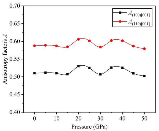 Elastic anisotropy is a crucial physical parameter for studying mechanical properties of anisotropic materials, and elastic anisotropy is described by the anisotropy factor A. In isotropic materials, A is equal to a unit (i.e., A = 1), but A is unequal to a unit for anisotropic materials, and when A is greater or less than the value of the one, the materials exhibit stronger anisotropy [41,42]. In addition, Yoo [43] put forward the cross-slip-pinning model to study the relationships between anisotropy factor A and mechanical properties. A higher A induced a larger force to drive the motion of screw dislocation, which motivated the process of cross-slip-pinning. For a cubic FeTi alloy, the anisotropy factors are calculated as follows [44,45]: