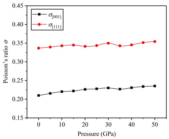Poisson’s ratio σ is considered as another crucial physical factor in studying the plasticity of materials, and the σ value is −1~0.5; a large σ value denotes good plasticity. Reed et al. [46] concluded that σ was between 0.25 and 0.5 in central force solids. Based on Equations (9) and (10) [44,47], and in the and directions are calculated at various pressures and plotted in Figure 8. The results show and under GPa, which means that the central force is the main interatomic bonding in the and directions. Additionally, and increase basically with the increase in applied pressure, but they fluctuate within the pressure range of GPa to GPa, and there is a maximum value at GPa, which indicates better plasticity. Therefore, the plasticity of materials can be enhanced under high pressure in the directions of and .