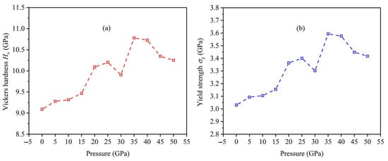 In the process of investigating mechanical properties of materials, two vital properties, including hardness and yield strength, need be considered, which are defined as the abilities of materials to resist deformation [52]. According to the previous works [53,54,55,56], the modified Vickers hardness computational model was derived by Equation (11) for polycrystalline materials [57] and . Equation (12) for calculating yield strength can be obtained via conventional empirical relation . Based on the calculated data, we plot the relation curves of the Vickers hardness and yield strength of the FeTi alloy versus applied pressure in Figure 10a,b. When the pressure is less than 25 GPa, and increase as pressure increases and then decrease, and there is a maximum value at GPa. When the pressure is greater than 35 GPa, the values of and continue to decrease. However, the and under high pressure are always larger than the value at GPa, indicating that high pressure can enhance the Vickers hardness and yield strength of the FeTi hydrogen storage alloy.