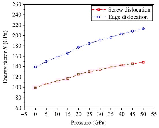 The energy factor K is an important parameter in investigating the dislocation nucleation capacity and plastic properties for crystalline materials. Generally, we use elastic constants to calculate the energy factor K of dislocation in anisotropic materials. For cubic crystals, Equations (13) and (14) give the expressions of K factors of edge and screw dislocations [58,59]. From the calculated results, Figure 11 depicts the variation curves of K factors of edge and screw dislocations versus applied pressure. The results demonstrate that the K factors of edge and screw dislocations increase as pressure increases, thereby suggesting that high pressure inhibits the nucleations of screw and edge dislocations and tends to reduce the plasticity of FeTi hydrogen storage alloys. In addition, the Kedge factor for edge dislocation is always larger with respect to screw dislocation, suggesting that edge dislocation is more difficult to nucleate with regard to screw dislocation.