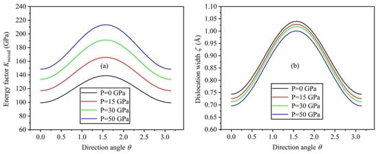 Relation curves of factor for mixed dislocation (a) and dislocation width (b) with regard to direction angle under different pressures.