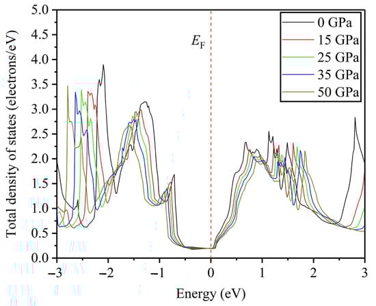 In the process of studying the bond mechanism of metals or alloys, the primary consideration is the electronic structure between atoms. We utilize it to describe the structural stability of the FeTi alloy at high pressure. To study the change in the total density of states (TDOS) at high pressure, Figure 13 plots the TDOS curves near the Fermi energy EF under 0, 15, 25, 35, and 50 GPa pressures. The results demonstrate that with the increase in pressure, the energy of the valence-band top (VBT) decreases, but the energy of the conduction-band bottom (CBB) increases, which increases the difficulty of the electron jump from the VBT to the CBB, and the binding forces between atoms get stronger, suggesting that high pressure is inclined to promote the structural stability of the FeTi hydrogen storage alloy, instead of structural transition induced by high pressure.