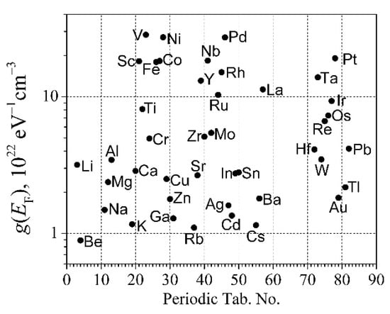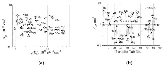 The electron-scattering cross-section of elemental metal distribution on DOS at the Fermi level is shown in Figure 5a at room temperature. The product , where is the volume for one free RM electron. The dependence of the volume on the periodic table is shown in Figure 5b at room temperature. The largest volume has Be and alkali metals and the smallest one has V, Ni, and Pd.