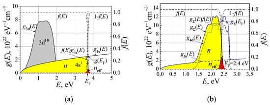 Figure 2 provides a schematic hypothetical illustration of the DOS for noble- and transition-group metals at room temperature, as described in [26]. In the case of noble metals (Figure 2a), the area beneath the curve gs(E)f(E) in yellow is obtained using Equation (4) and represents the total density of valence electrons in the conduction band; the red area corresponds to the effective density of free RM electrons evaluated using Equation (1). It can be seen that the d-band is not created in noble metals, because this band is lower by 2 eV than the Fermi-level energy. For transition metals, the d-band is not entirely filled, and the total effective density of the free RM electrons can be described as = , where is obtained from the electronic heat measurements. As can be seen from Figure 1, the DOS g(EF) at the Fermi surface for transition-group metals is much larger than that for alkali and noble metals.