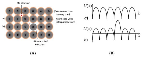 (A) Schematic representation of a two-dimensional pattern of metal atoms, and (B) a schematic potential U(x) distribution. In row (b) one atom excites the RM electron, causing the distortion of the potential periodicity in row (b) in Figure 3B.