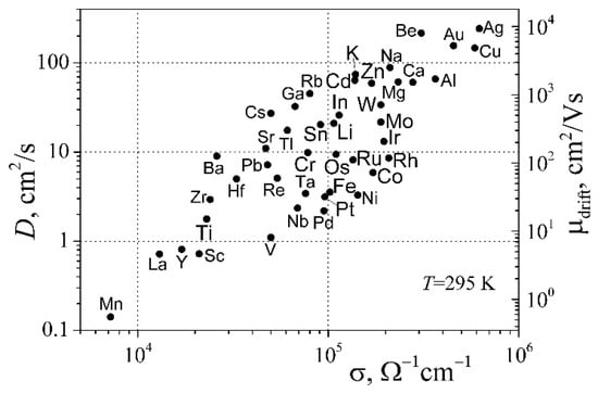 where q is the electron charge, D is the diffusion coefficient, and μdrift is the drift mobility of free RM electrons. From this expression follows the Einstein relation D/= kT/q, which is valid for materials with any degree of the degeneration of electron gas with one type of free charge carriers (electrons and holes). The relationship between the electrical conductivity and both the diffusion coefficient and the drift mobility is described by Equation (7) and is shown in Figure 4. Considering that values of the electrical conductivity and the electronic heat capacity are well known and are available from the Handbook [28], values of the diffusion coefficient and the drift mobility of free RM electrons were calculated using Equations (6) and (7).
