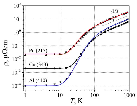 The resistivity dependence on temperature for Pd, Cu, and Al. The points are experimental data taken from [28], the number in brackets near the chemical symbol is the Debye temperature Θ in K used to calculate resistivity, and the solid lines are calculated with Equation (22).