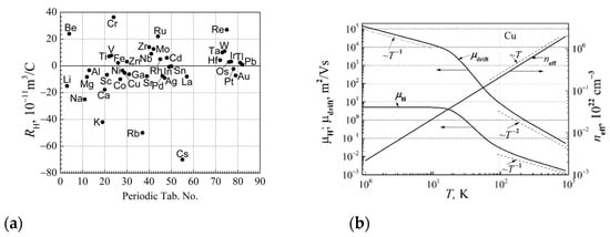 The magnetic flux density during the Hall coefficient measurement was in the range (0.5–1.3) T. As can be seen from Figure 7a, the Hall coefficient for different elemental metals has different signs, i.e., in different elemental metals prevail in electronic-type or hole-type charge carriers.
